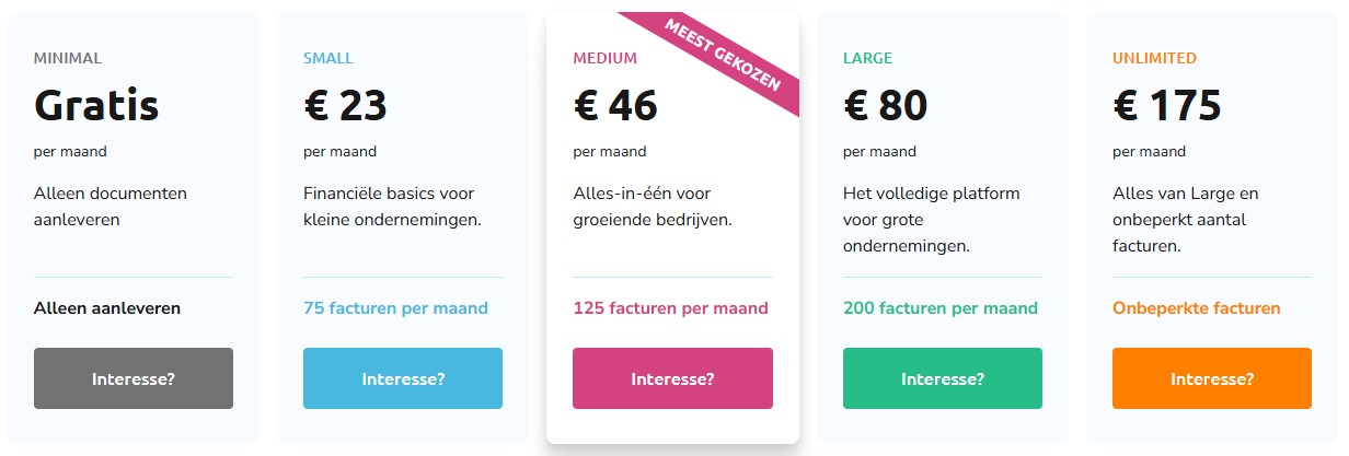 Yuki biedt meerdere pakketten aan met verschillende prijskaartjes. Kleine ondernemers adviseren we het gratis pakket te nemen. Hiermee kun je documenten aanleveren, communiceren en samenwerken met je boekhouder, documenten en gegevens opslaan, de mobiele app gebruiken en krijg je inzicht in de belangrijkste financiële indicatoren.